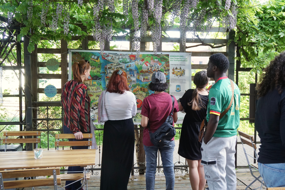 Auch die Leute, die nicht am Pub Quiz teilnahmen, konnten sich weiter mit dem Thema Ernährung auseinandersetzten durch ein Wimmelbild auf dem verschiedene Arten der Lebensmittelproduktion entdeckt werden konnten und eine Rezepte-Tauschecke. Viele nutzten die Gelegenheit auch um sich einfach weiter zu unterhalten und kennenzulernen. So verging die Zeit bis zum Abendessen ganz schnell.